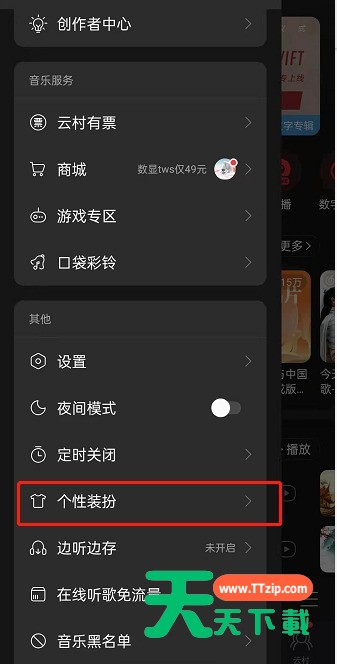 网易云音乐是一款个性化十足的听歌软件,我们每次打开都能看到网易云的专属封面,其实这个封面是可以进行更改的,下面天天下载给大家带来了网易云音乐自定义封面步骤一览,一起来看看吧。 网易云音乐启动封面怎样修改?网易云音乐自定义封面步骤一览 1、打开软件后,选择左上角的三条横杠。 2、选择如图的个性装扮。 3、点击如图的更多功能。 4、点击自定义即可。开启自定义需要大家开通会员,你还能选择更多官方提供的画面。 以上这篇文章就是网易云音乐自定义封面步骤一览,更多手机教程请关注天天下载! @天天下载 除特别注明外,本站所有文章均为 天天下载 原创,转载请注明出处来自 https://www.ttzip.com/32656.html