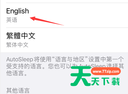 如果你的手机默认是中文的话,autosleep的界面也会显示中文,大家可以在系统设置中更改首选语言,下面天天下载给大家介绍一下autosleep设置成英文方法,有需要的小伙伴一起来学习下吧。 autosleep如何设置成英文?autosleep设置成英文方法分享 1、进入系统设置 2、点击autosleep 3、进入语言 4、点击英语即可 以上这篇文章就是autosleep设置成英文方法,更多手机教程请关注天天下载! @天天下载 除特别注明外,本站所有文章均为 天天下载 原创,转载请注明出处来自 https://www.ttzip.com/32659.html