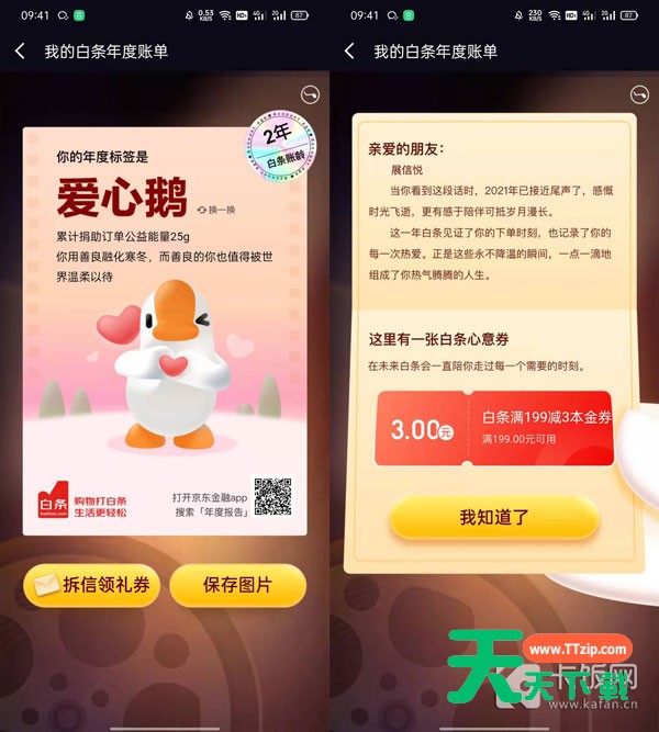 5、最后可以获得你的年度标签,还可以点击【拆信领礼券】获得白条心意券。