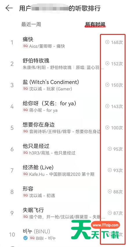 很多小伙伴都不知道网易云音乐在哪看歌曲播放次数?下面天天下载给大家带来了网易云音乐听歌排行查询步骤介绍,一起来看看吧。 网易云音乐在哪看歌曲播放次数?网易云音乐听歌排行查询步骤介绍 1、打开网易云音乐,点击左上角【三】。 2、在左侧弹出来的页面中点击左上角【头像账号】进入个人中心。 3、在个人主页下滑,找到音乐品牌栏,点击【听歌排行】。 4、在这大家可以看到自己一周以及所有时间的听歌排行及播放次数。 以上这篇文章就是网易云音乐听歌排行查询步骤介绍,更多手机教程请关注天天下载! @天天下载 除特别注明外,本站所有文章均为 天天下载 原创,转载请注明出处来自 https://www.ttzip.com/32898.html