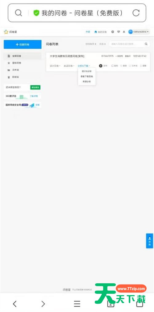 小伙伴们知道问卷星在哪里查询个人答题记录吗?今天天天下载就来讲解问卷星查询个人答题记录的方法,感兴趣的快跟天天下载一起来看看吧,希望能够帮助到大家呢。 问卷星在哪里查询个人答题记录?问卷星查询个人答题记录的方法 第一步:在百度浏览器app搜索问卷星并进入。 第二步:选择免费使用,然后输入账号密码验证身份登录。 第三步:找到左上角三条杠,点击更多,进入个人中心即可显示参与过的问卷信息,还可以查看统计分析等详情。 以上就是给大家分享的问卷星在哪里查询个人答题记录的全部内容,更多精彩内容尽在天天下载! @天天下载 除特别注明外,本站所有文章均为 天天下载 原创,转载请注明出处来自 https://www.ttzip.com/32977.html