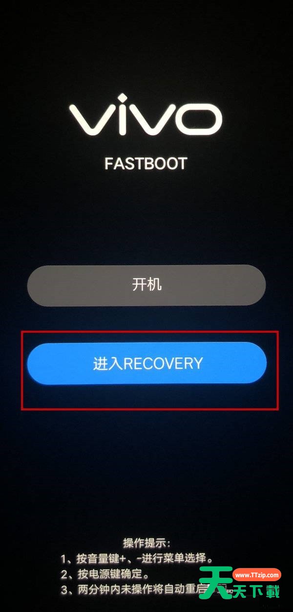 2、然后当出现vivo界面时松开锁屏键继续按住音量加键,选择进入recovery模式