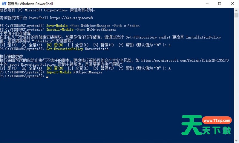 接着,我们以管理员身份运行 Powershell,然后输入(其中 C: oken,为我们刚刚新建文件夹的路径): Save-Module -Name NtObjectManager -Path c: oken 并回车(第一次安装会出现询问,输入“Y”并回车):