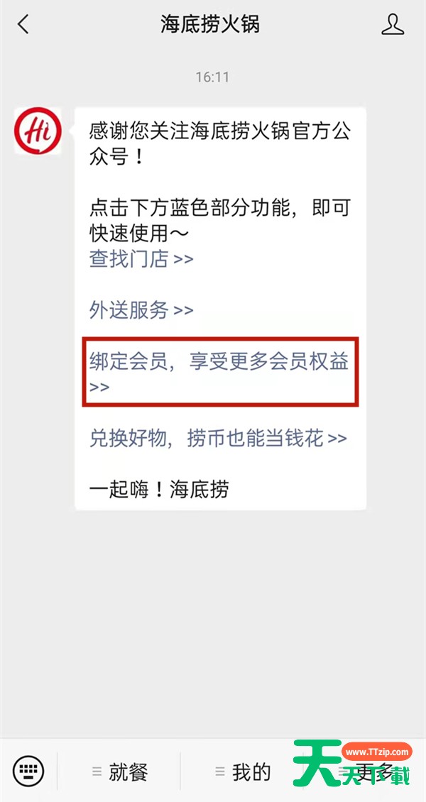 小伙伴们知道海底捞会员在哪注册吗?今天天天下载就来讲解海底捞会员的注册方法,感兴趣的快跟天天下载一起来看看吧,希望能够帮助到大家呢。海底捞会员在哪注册?海底捞会员注册步骤一览第一步:微信搜索并进入海底捞公众号。 第二步:点击绑定会员按提示操作即可注册。 以上就是给大家分享的海底捞会员在哪注册的全部内容,更多精彩内容尽在天天下载!@天天下载 除特别注明外,本站所有文章均为 天天下载 原创,转载请注明出处来自 https://www.ttzip.com/33893.html