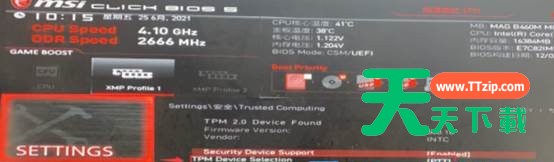 自Win11系统推出之后,很多用户都想升级使用。那就有一些使用联想异能者DIY主机的用户咨询天天下载,自己在安装过程中,遇到不支持TPM2.0的提示,这该怎么办呢?还能升级Win11吗?下面我们就来看看联想异能者DIY主机开启TPM2.0的方法教程。 TPM是什么意思? TPM其实就是可信平台模块,英文全称Trusted Platform Module,是一项安全密码处理器的国际标准。TPM最新的版本是2.0,也就是Win11运行所要求的版本。通常来说,TPM都有单独的芯片,集成在主板上。 TPM的作用: TPM是实现信任计算技术的模块,是经常被用来存储密钥的安全芯片。有点像Apple T系列的安全部分。TPM是国际通用的可信任计算技术标准,Windows必须借助这个芯片才能实现Windows设备加密、高级BitLocker加密等安全特性,帮助Windows更加严格地保护你的数据。TPM并不是只有这一个作用,而对于消费者来说保护数据安全是最基本的作用了。其实这种东西早就应该强制了。Windows 10是建议,Windows 11改成最低要求了,强推TPM落地我举双手双脚赞成。新主板都支Intel PTT或者AMD的类似的技术。 Co系列微星MSI主板(Intel平台)开启方法: 重启电脑,连续按 Del 键,进入BIOS设置,然后按 F7 键,进入高级模式。依次选择Settings - Security (安全) - Trusted Computing,将TPM Device Selection改为PTT选项,然后按 F10 键,保存BIOS即可