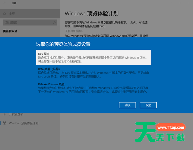 这时候我们需要先加入下方的Windows预览体验计划,登录自己的微软账户后,选择一个win11获取渠道,这里我选择的是DEV渠道: