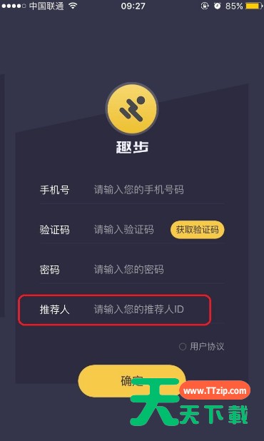 趣步是一款手机运动软件,不少小伙伴都在是使用。那么趣步如何注册呢?下面天天下载就为大家详细的介绍一下,大家感兴趣的话就一起来了解下吧!趣步如何注册 趣步注册方法 首先打开手机桌面趣步APP。 在登陆界面中,老用户可直接登陆,新用户点击注册即可。 在注册界面填写手机号码/验证码/密码等信息,*重要的一点就是“推荐人ID”大家可以填写“85745408” 在用户协议界面,将协议内容拉到底,点击确定即可。之后在登陆界面输入账号和密码就可以进入主界面了。 以上这里为各位分享了趣步注册方法,有需要的小伙伴赶快来看看本篇文章吧。@天天下载 除特别注明外,本站所有文章均为 天天下载 原创,转载请注明出处来自 https://www.ttzip.com/35301.html