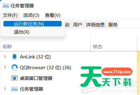 2、打开“任务管理器”后点击“文件”--》“运行新任务”;