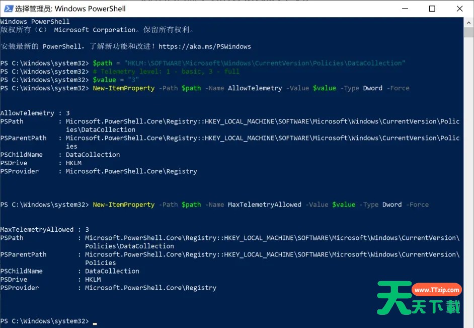 2、执行下面的命令修改注册表项。 $path = “HKLM:SOFTWAREMicrosoftWindowsCurrentVersionPoliciesDataCollection”。 # Telemetry level: 1 - basic, 3 - full $value = “3” New-ItemProperty -Path $path -Name AllowTelemetry -Value $value -Type Dword -Force New-ItemProperty -Path $path -Name MaxTelemetryAllowed -Value $value -Type Dword -Force 3、效果如下。