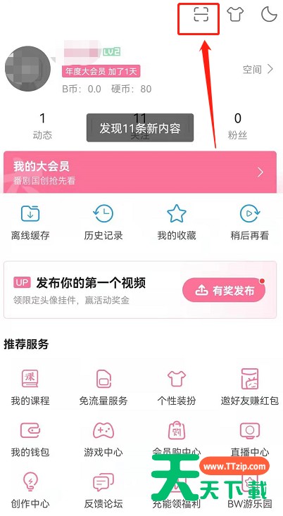 2、打开手机哔哩哔哩点击头像进入个人中心页,点击右上角图标扫一扫。