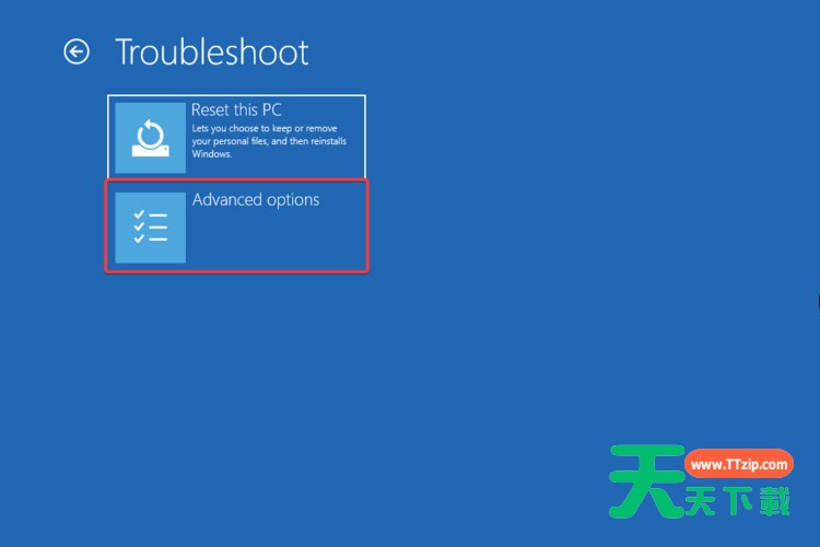 按住键盘上的Shift键,然后单击Restart重启键。 重定向到选项屏幕后,选择疑难解答。