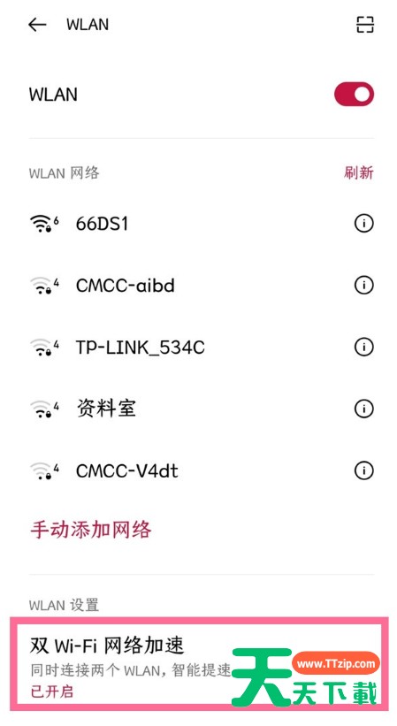 一些网友表示还不太清楚一加9pro如何设置双wifi网络加速的相关操作,而本节就介绍了一加9pro设置双wifi网络加速方法,还不了解的小伙伴就跟着天天下载学习一下吧,希望对你们有所帮助。一加9pro如何设置双wifi网络加速?一加9pro设置双wifi网络加速方法 1、在手机设置菜单中点击【WLAN】。 2、点击【双wifi网络加速】。 3、打开【智能启动双wifi网络加速】右侧的开关。 以上这里为各位分享了一加9pro设置双wifi网络加速方法。有需要的小伙伴赶快来看看本篇文章吧!@天天下载 除特别注明外,本站所有文章均为 天天下载 原创,转载请注明出处来自 https://www.ttzip.com/38592.html