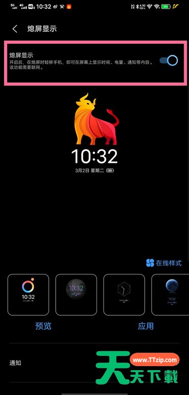 现在大多手机都采用了oled显示屏,小伙伴们你们知道vivo手机如何调整熄屏时间呢?今天天天下载很乐意与大家分享vivo手机设置息屏显示时间方法,感兴趣的可以来了解了解哦。vivo手机如何调整熄屏时间?vivo手机设置息屏显示时间方法 1、在手机设置菜单中点击【桌面、锁屏与壁纸】。 2、点击【熄屏显示】选项。 3、打开【熄屏显示】右侧的开关即可,还可以自定义设置熄屏样式、显示方式等。 以上这里为各位分享了vivo手机设置息屏显示时间方法。有需要的小伙伴赶快来看看本篇文章吧!@天天下载 除特别注明外,本站所有文章均为 天天下载 原创,转载请注明出处来自 https://www.ttzip.com/38615.html