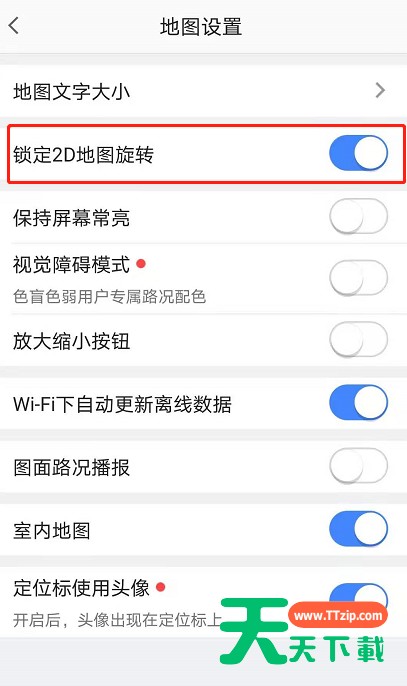 小伙伴们你们知道德地图怎么设置横屏显示呢?今天天天下载很乐意与大家分享高德地图设置横屏显示的方法,感兴趣的可以来了解了解哦。高德地图怎么设置横屏显示?高德地图设置横屏显示的方法 1、首先打开高德地图软件,在右下角“我的”页面中点击上方齿轮图标进入设置。 2、在设置中选择“地图设置”。 3、将“锁定2D地图旋转”右侧按钮开启,如图呈蓝色即为开启成功。 4、开启后,用户们在导航时摇摇手机即可切换成横屏。 以上这里为各位分享了高德地图设置横屏显示的方法。有需要的小伙伴赶快来看看本篇文章吧!@天天下载 除特别注明外,本站所有文章均为 天天下载 原创,转载请注明出处来自 https://www.ttzip.com/38764.html