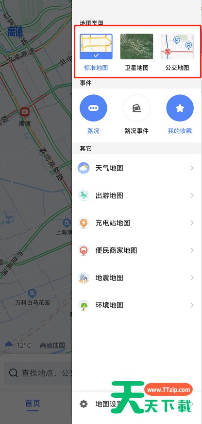 一些网友表示还不太清楚高德地图怎么开启公交地图的相关操作,而本节就介绍了高德地图开启公交地图的方法,还不了解的小伙伴就跟着天天下载学习一下吧,希望对你们有所帮助。高德地图怎么开启公交地图 高德地图开启公交地图的方法 1.在高德地图首页,进入右侧设置界面 2.上方有地图类型选项,一般默认是标准地图,大家可以自行勾选 3.点击公交地图,切换成公交线路显示 4.设置完成后就可以在首页上看到地铁站、公交车等信息了 以上这里为各位分享了高德地图开启公交地图的方法。有需要的小伙伴赶快来看看本篇文章吧!@天天下载 除特别注明外,本站所有文章均为 天天下载 原创,转载请注明出处来自 https://www.ttzip.com/39609.html