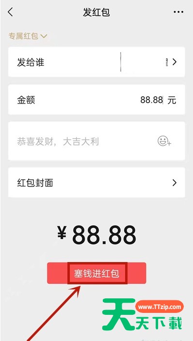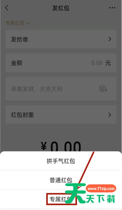 微信群如何发专属红包? 很多小伙伴们还不知道怎么操作,下面天天下载给大家介绍微信群发放专属红包方法,一起来看看吧!微信群如何发专属红包 微信群发放专属红包方法 1、打开微信群,点击右下角【+】,点击【红包】。 2、发红包页面左上角选择【专属红包】。 3、【发给谁】处指定领取人。 4、填写金额后,点击【塞钱进红包】,验证支付密码后即可。 以上就是微信群发放专属红包方法,更多手机教程尽在天天下载!@天天下载 除特别注明外,本站所有文章均为 天天下载 原创,转载请注明出处来自 https://www.ttzip.com/39968.html