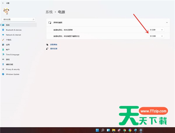 系统有自带的屏幕自动休眠功能,一方面是为了在我们没使用电脑的情况下节约资源,另一方面是可以在我们人不在的情况下保护我们的隐私,如果我们想要自定义屏幕的休眠时间又要怎么设置呢,下面给大家带来详细的设置步骤。 步骤如下 打开开始菜单,点击【设置】。 依次点击【系统】》》【电源】。 进入电源界面,即可设置屏幕关闭时间和睡眠时间。 以上这里为各位分享了Win11设置屏幕使用时间的技巧。有需要的朋友赶快来看看本篇文章吧。 @天天下载 除特别注明外,本站所有文章均为 天天下载 原创,转载请注明出处来自 https://www.ttzip.com/4049.html