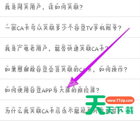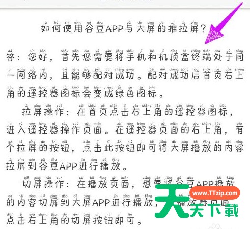很多小伙伴都在用谷豆tv看手机电视,那么,谷豆tv怎么投屏到电视呢?下面天天下载就为大家详细的介绍一下,大家感兴趣的话就一起来了解下吧!谷豆tv怎么投屏 谷豆tv投屏方法 首先打开谷豆tvAPP。然后点击我的。再点击帮助说明。 然后点击“如何使用古豆APP与大屏推拉屏?” 进入即可查看通过遥控器图标进行投屏操作的步骤。 最后如下图所示,可以直接点击投屏按钮进行投屏。 以上这篇文章就是谷豆tv投屏方法,更多手机教程请关注天天下载!@天天下载 除特别注明外,本站所有文章均为 天天下载 原创,转载请注明出处来自 https://www.ttzip.com/40633.html