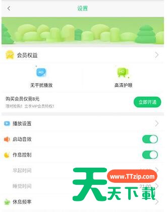 儿歌点点怎么设置观看时间? 为了防止孩子沉迷和保护孩子视力,儿歌点点内置了作息控制以确保孩子们的作息时间,下面天天下载介绍儿歌点点作息控制设定方法,希望能够帮助到各位家长们。儿歌点点怎么设置观看时间 儿歌点点作息控制设定方法 打开儿歌点点APP,点击【我的】。 点击左上角齿轮图标。 找到【作息控制】,点击开启然后根据情况设定作息时间。以上就是天天下载为大家带来的儿歌点点设置作息时间的方法,希望本文能为各位家长带来帮助。@天天下载 除特别注明外,本站所有文章均为 天天下载 原创,转载请注明出处来自 https://www.ttzip.com/40787.html
