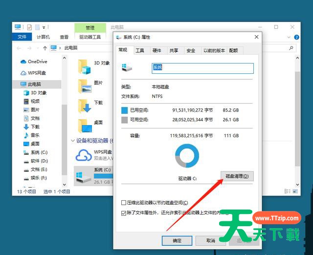 那么我们怎么清理C盘呢?为了让更多的人了解C盘的深度清理,天天下载给大家整理出了6大招,希望可以帮助到大家! 第一招:C盘垃圾清理 日常的清理,很多用户也只是将临时文件删除,殊不知还有好些文件可以删除,如“以前的Windows安装”、“Windows更新清理”。如何清理呢? 第一步:打开【此电脑】,右键点击C盘,选中【属性】;进入属性页面后,点击【磁盘清理】,接下来系统就会自动计算可释放的空间量。