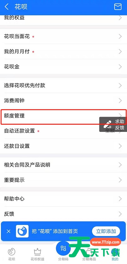 在平时支付宝花呗额度怎么调整的呢?天天下载接下来就为大家介绍下关于支付宝花呗额度自主调整方法步骤,希望能帮助到大家!支付宝花呗额度怎么调整 支付宝花呗额度自主调整方法 1、打开支付宝页面,在“我的”页面中找到花呗进入。 2、进入花呗页面后,再次点击花呗页面右下角的“我的”进入。 3、接着,在页面中找到“额度管理”。 4、这里大家可以看到花呗自定义的额度,在横线上输入更改金额。 5、最后点击确定调整即可设置成功。 以上就是支付宝花呗额度自主调整方法,希望能对大家有所帮助哦!@天天下载 除特别注明外,本站所有文章均为 天天下载 原创,转载请注明出处来自 https://www.ttzip.com/41127.html