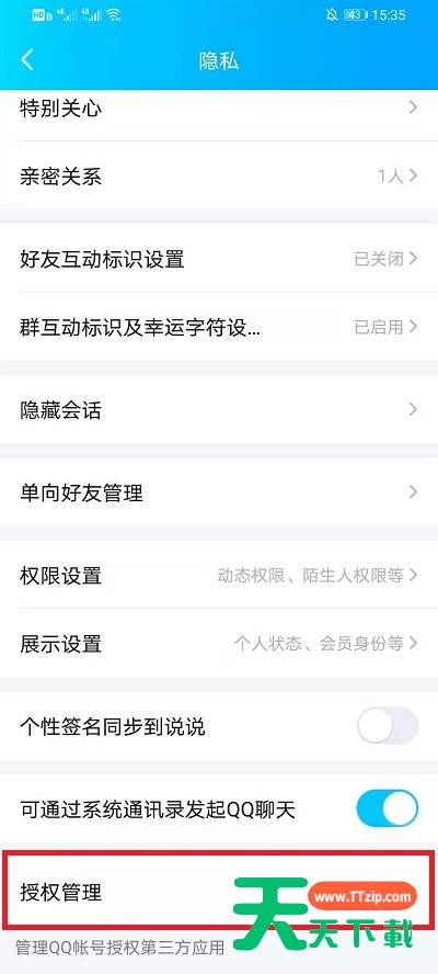 QQ扫码授权登录怎么解除授权?很多用户尝试过想要解除授权,下面天天下载给大家带来qq扫码授权登录解除授权教程,一起来看看吧。QQ扫码授权登录怎么解除授权 qq扫码授权登录解除授权教程 1、打开手机QQ,然后在QQ的主页界面点击左上角的【个人头像】,点击进入到左侧功能界面; 2、在功能界面点击最左下角的【设置】,点击进入到设置界面; 3、在设置界面点击【隐私】功能,进入到隐私功能界面; 4、在隐私功能界面中我们可以向上滑动屏幕,然后在最下方可以看到【授权管理】,点击进入到授权管理界面; 5、在授权管理界面点击想要解除的授权程序,点击进入到管理界面; 6、然后在界面中,直接解除授权就可以完成操作。 以上就是qq扫码授权登录解除授权教程,更多手机教程尽在天天下载!@天天下载 除特别注明外,本站所有文章均为 天天下载 原创,转载请注明出处来自 https://www.ttzip.com/41328.html