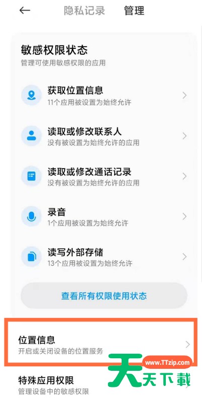 小米10定位去哪设置?很多用户还不知道怎么操作,下面天天下载则是带来了两种超级便捷启用方法,赶快来看看并学习一下吧。小米10定位去哪设置 启用小米10定位功能方法 1、从手机顶部右侧下拉拉出控制中心,点击【位置信息】即可。 2、或者在手机设置中点击【隐私保护】。 3、再点击管理,选择位置信息。 4、开启【开启位置服务】开关即可。 以上就是启用小米10定位功能方法的全部内容了,更多手机教程尽在天天下载!@天天下载 除特别注明外,本站所有文章均为 天天下载 原创,转载请注明出处来自 https://www.ttzip.com/41905.html