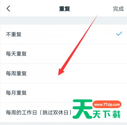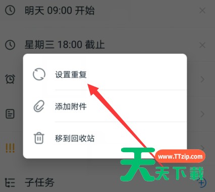 在钉钉创建任务之后,可以把任务设置重复周期,打开设置界面选择重复的周期,可以选择或者自定义重复周期。下面天天下载给大家整理了相关步骤介绍,感兴趣的小伙伴不要错过哦!钉钉怎么设置重复任务? 钉钉设置重复任务的步骤教程 1、进入钉钉任务界面打开任务。 2、点击界面上方的三个点选项。 3、弹出的界面选择设置重复。 4、然后在这里设置重复的选项。 5、或者点击下方的自定义选项。 6、然后打开的界面进行设置,然后点击完成。 以上这篇文章就是钉钉设置重复任务的步骤教程,感兴趣的小伙伴快来学习一下吧!更多手机教程请浏览天天下载!@天天下载 除特别注明外,本站所有文章均为 天天下载 原创,转载请注明出处来自 https://www.ttzip.com/42187.html