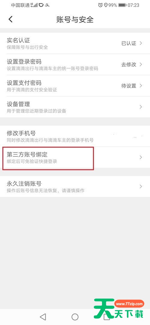 有时候我们在使用滴滴的时候,想解绑微信账号,下面天天下载就为大家带来滴滴出行解绑微信步的具体操作方法,想知道的话就来看看吧。滴滴出行怎么解绑微信账号?滴滴出行解绑微信步骤教程 1、打开滴滴出行,点击头像,选择设置,如下图所示: 2、在滴滴出行设置中,点击账号与安全,如下图所示: 3、在账号与安全中,点击第三方账号绑定,如下图所示: 4、进去之后,可以看到绑定的微信,点击绑定的账号,如下图所示: 5、弹出框之后,点击解除绑定就完成了,如下图所示: 以上就是关于滴滴出行解绑微信步的全部内容了,希望对大家有所帮助。@天天下载 除特别注明外,本站所有文章均为 天天下载 原创,转载请注明出处来自 https://www.ttzip.com/43185.html