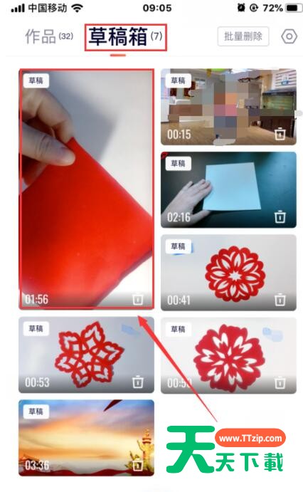 在作品库里点开【草稿箱】选取需要添加音乐的视频。