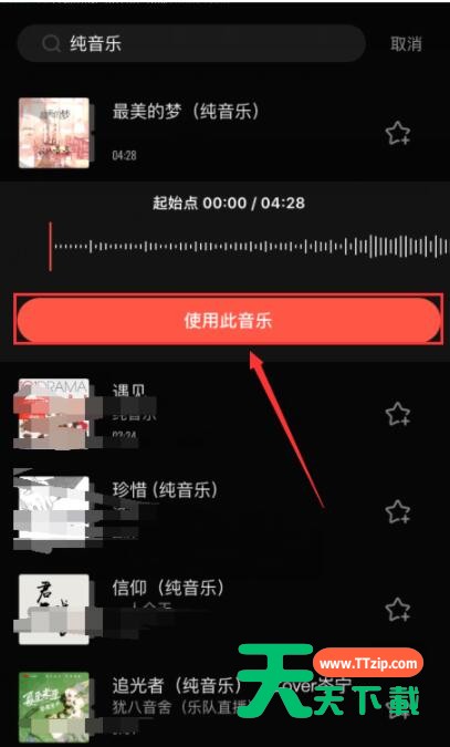 可以在*上的搜索栏输入歌名进行搜索,选取需要添加的音乐点【使用此音乐】。