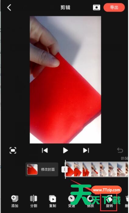 进入【剪辑】页面,点下面的【旋转】图标,选将视频旋转到正面。