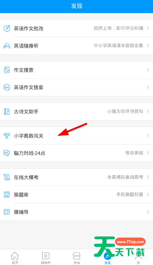 亲们或许不知道小猿搜题如何使用小学奥数闯关呢,那么今天天天下载就讲解小猿搜题使用小学奥数闯关的操作内容哦,希望能够帮助到大家呢。 小猿搜题使用小学奥数闯关的操作内容 1、先点击软件下方的“发现”选项,进入发现页面。 2、接着在出现的选项中选择“小学奥数闯关”功能,开始选择难度。 3、选择好自己适合的难度,就能够进行小学奥数闯关了。 快来学习学习小猿搜题使用小学奥数闯关的操作内容吧,一定会帮到大家的。 @天天下载 除特别注明外,本站所有文章均为 天天下载 原创,转载请注明出处来自 https://www.ttzip.com/46243.html