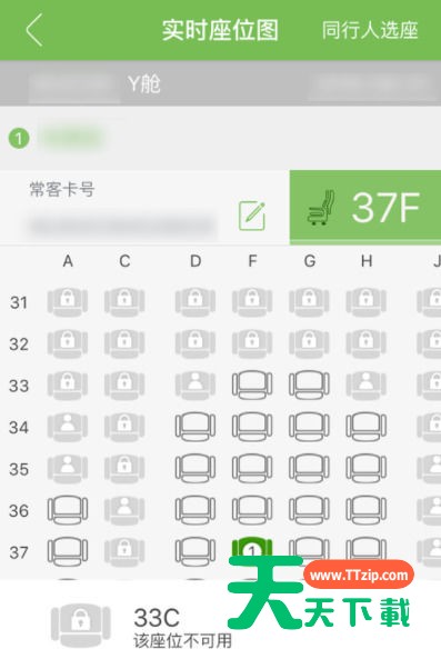 5.进入“实时座位图”页面,挑选喜欢的座位(选中后的座位会标为绿色),您也可以点击右上角【同行人选座】,添加同行人并为其一同办理,选好后点击下方【确定】