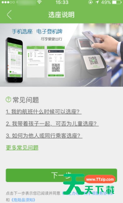 3.进入“选座说明”页面,在这里可以查看与值机相关的常见问题,点击【下一步】