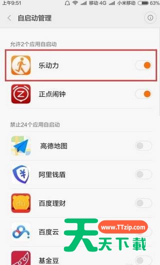 4、在打开的自启动管理列表中,找到“乐动力”应用。然后在点击其右侧的开关,让其加入允许自启动列表中;