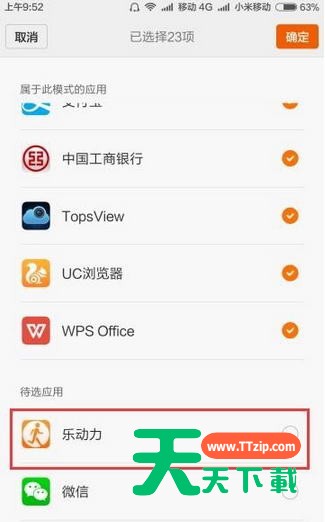 10、在属于此模式的应用列表中,找到“乐动力”一项,然后把其后的勾选去掉,让其不再属于神隐模式。通过上面的设置,你可以发现乐动力即使在后台,也可以正常的计步了。