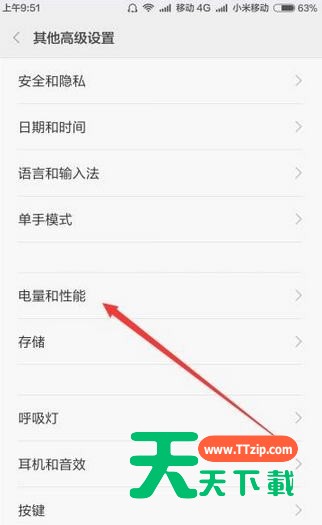 7、打开“其它高级设置”主界面后,选择其中的“电量和性能”快捷菜单;