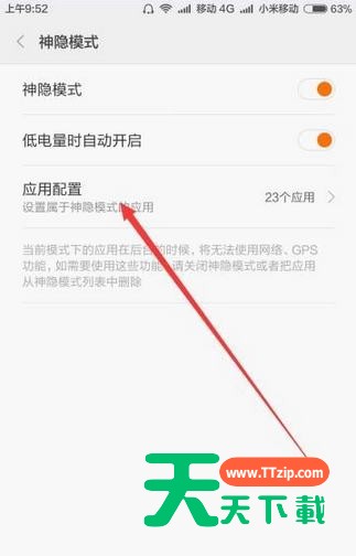 9、在神隐模式界面中,点击“应用配置”菜单项,在这里可以管理安装的应用是否加属于神隐模式;