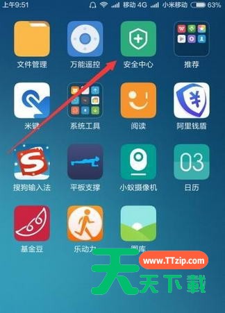 1、在手机上找到“安全中心”的图标,点击图标后进入安全中心设置主界面;