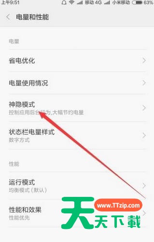 8、在电量和性能主界面中找到“神隐模式”菜单项,点击该菜单项进入“神隐模式”主界面;