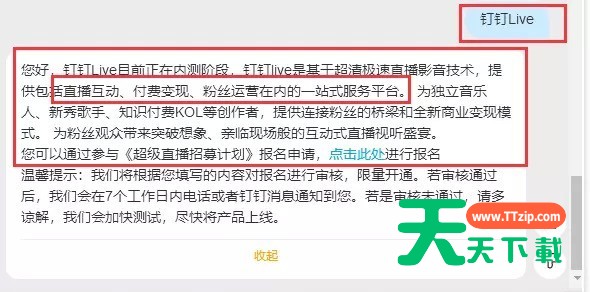 小伙伴们你们知道钉钉Live是什么吗?今天天天下载很乐意与大家分享钉钉Live玩法介绍,感兴趣的可以来了解了解哦。 钉钉Live玩法介绍 第一:登录钉钉客户端点击左上角的【头像】。 第二:弹出对话框选择【我的客服】然后选择【钉小蜜】选项。 第三:【钉钉Live】是提供包括直播互动、付费变现、粉丝运营在内的一站式服务平台。 第四:钉钉Live定位为付费式的直播交互功能的平台。 这就是钉钉Live是什么?玩法介绍的全部内容了,希望以上内容对小伙伴们有所帮助。 @天天下载 除特别注明外,本站所有文章均为 天天下载 原创,转载请注明出处来自 https://www.ttzip.com/47014.html