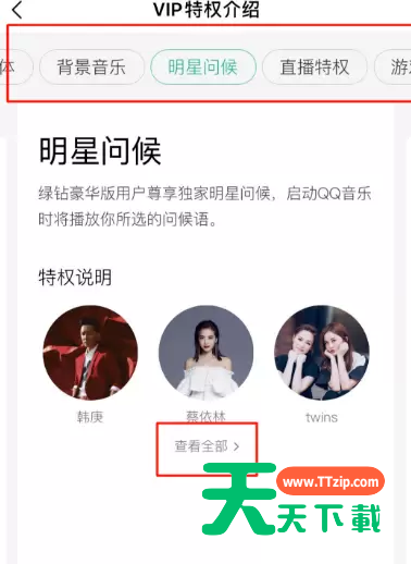 3、右划选择特权,找到“明星问候”,查看全部。
