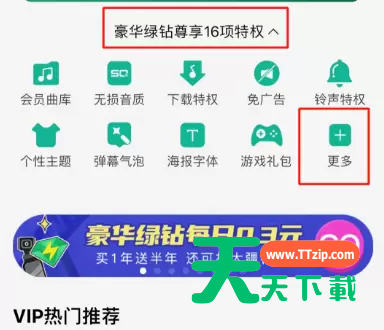 2、点击绿钻尊享特权下拉箭头,然后点击更多。
