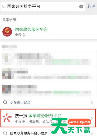 2、在搜索框中输入“国家政务服务平台”,在搜索结果中点击选择“搜一搜 国家政务服务平台”。