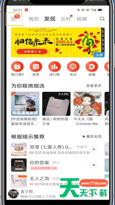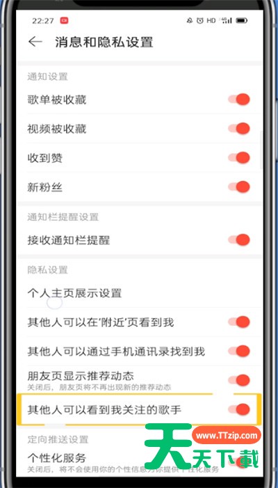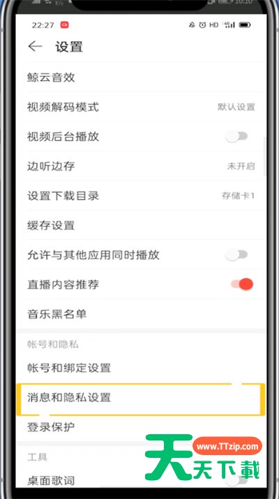 估计很多新手小伙伴还不熟悉网易云音乐隐藏关注的人的操作,而下面天天下载就分享了网易云音乐隐藏关注的人的详细教程,希望对你们有所帮助哦。 网易云音乐隐藏关注的人的详细教程 1、首先我们打开网易云 2、点击左上角的三条杠 3、点击设置 4、点击消息和隐私设置 5、找到其他人可以看到我关注的歌手,取消勾选即可 以上就讲解了网易云音乐隐藏关注的人的详细操作过程,希望有需要的小伙伴都来学习哦。 @天天下载 除特别注明外,本站所有文章均为 天天下载 原创,转载请注明出处来自 https://www.ttzip.com/47130.html