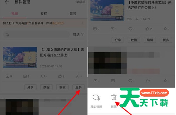 今天天天下载给大家讲解哔哩哔哩怎么删除自己的作品?有需要或者有兴趣的小伙伴们可以看一看下文,相信对大家会有所帮助的。 哔哩哔哩中删除自己的作品的方法点击创作首页 打开哔哩哔哩软件,点击我的,在我的界面中点击创作首页。 2 点击稿件管理 进入创作者中心之后,点击稿件管理选项。 3 点击删除 点击稿件后面的更多选项,并点击删除按钮。 以上就是天天下载为大家带来的哔哩哔哩怎么删除自己的作品的操作方法,更多手机教程尽在天天下载! @天天下载 除特别注明外,本站所有文章均为 天天下载 原创,转载请注明出处来自 https://www.ttzip.com/47361.html