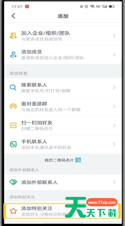 钉钉怎么设置特别关注?相信很多使用该软件的小伙伴们对此都很感兴趣,下面就和大家来分享一下,希望可以帮助到大家。 钉钉中设置特别关注的方法教程 1、首先我们打开钉钉 2、点击通讯录 3、点击右上角的添加图标 4、滑动到底部 5、点击添加特别关注 6、点击右上角的添加 7、选择你要添加的好友 8、点击他的头像即可添加 以上就是天天下载为大家带来的钉钉怎么设置特别关注的操作方法,更多手机教程尽在天天下载! @天天下载 除特别注明外,本站所有文章均为 天天下载 原创,转载请注明出处来自 https://www.ttzip.com/47396.html