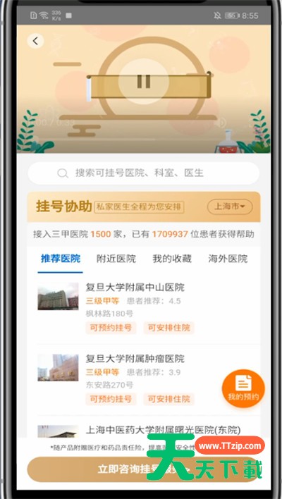 各位使用平安好医的同学们,你们知道怎么预约挂号吗?在这篇教程内天天下载就为各位呈现了平安好医生中预约挂号的简单过程。 平安好医生中预约挂号的简单过程 1、首先我们打开平安好医生 2、点击搜索框,输入预约挂号,进入预约挂号 3、找到你需要挂号的医院点击进入 4、确定科室 5、选择好日期医生后即可挂号 以上就是天天下载为大家带来的平安好医生怎么预约挂号的操作方法,更多手机教程尽在天天下载! @天天下载 除特别注明外,本站所有文章均为 天天下载 原创,转载请注明出处来自 https://www.ttzip.com/47450.html