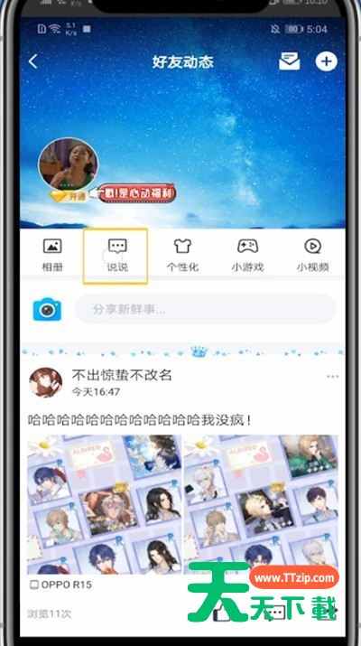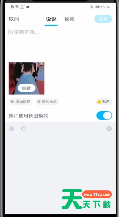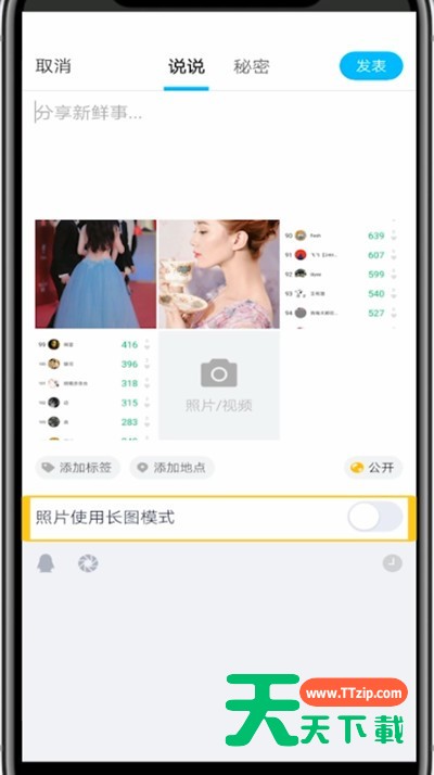 亲们想知道QQ怎么发长图给好友的操作吗?下面就是天天下载整理的QQ中发长图给好友的方法教程,赶紧来看看吧,希望能帮助到大家哦! QQ中发长图给好友的方法教程 1、首先我们打开QQ 2、点击右下角的动态 3、点击好友动态 4、点击说说 5、点击照片 6、选择你要发送的照片 7、勾选照片使用长图模式 8、将公开设置为私密 9、点击发表 10、然后我们点击图片 11、点击右下角的三个点 12、点击发送到QQ 13、选择好友即可发送 以上就是天天下载为大家带来的QQ怎么发长图给好友的操作方法,更多手机教程尽在天天下载! @天天下载 除特别注明外,本站所有文章均为 天天下载 原创,转载请注明出处来自 https://www.ttzip.com/48120.html